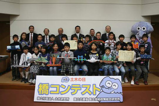 橋コンテストの対象者はつくば市内の小学5年生で、工作用ボール紙を用いて“ぼくのはし、わたしのはし”をテーマに、独創的、夢のある橋を作ってもらいました。