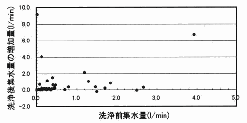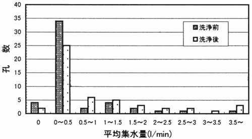 洗浄後の集水量は、洗浄前と比べて毎分0.5リットル未満のものが減少し毎分0.5リットル以上のものが増加しており洗浄の効果が認められ、全体として平均値で毎分0.7リットルの改善が図られた。 |