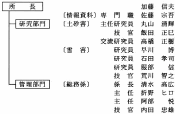 昭和63年度には、昭和60年度の集落を対象とした雪崩対策事業の創設及び昭和61年1月の新潟県能生町棚口で発生した表層雪崩災害等を契機とした集落雪崩対策の研究課題が加わり、集落雪崩の被害予測手法や雪崩防護施設の設計に関する調査を開始し現在の雪害部門に拡充されました。これらの試験研究成果は「集落雪崩対策工事技術指針(案)(平成8年2月)」に反映されています。平成2年度には創立30周年を迎え、7月に新井市総合文化ホールで記念式典が行われました。また、猿供養寺地すべり試験地に加え、1月に沖見地すべり試験地を設け、融雪地すべりの機構解明のための地すべり動態観測を開始し、平成6年に融雪観測施設を設置する等の充実を図ってきました。 |