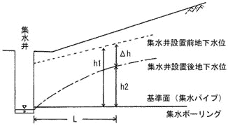 @ 地下水位の低下形状 図−2には、集水井設置に伴う地下水位の低下形状を示しました。集水井設置後の地下水位h2は、概ね集水井の近くでは低く、集水井からの距離Lが長くなるにつれて高くなる傾向が認められます。これは、集水ボーリングが平面的には扇形に設置されるため、集水井の近くでは集水ボーリング設置密度が高く、遠くでは低くなることによる集水能力の差によると考えられます。