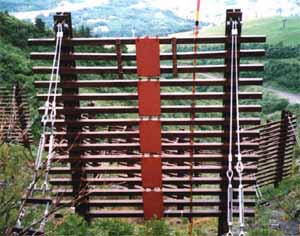 調査方法は、雪圧の鉛直分布観測を行うため、高さ4mと6m鉛直型雪崩予防柵を対象とし、かつ設置箇所斜面が同一地形に近い状態の場所を選定し、鉛直型雪崩予防柵の山側に受圧板(0.5×0.85m,厚さ9mm)を縦方向に設置し(写真−2参照)、1受圧板に3個のロードセルを設置、それぞれの受圧板にかかる雪圧を計測するものです。また、積雪各層の密度と層厚、層構造等を計測観測するため積雪断面観測も行っています。 (文責:佐藤)