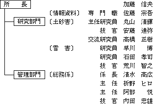 研究員 服部 信この度、4月1日付けで北陸地方建設局河川部河川工事課へ出向することとなりました。試験所には、平成8年4月に松本砂防工事事務所から来て、3年間お世話になりました。研究という不慣れな仕事を、試行錯誤しながら自分なりに行って来たつもりでしたが、転勤の時を迎え、改めて“雪”の難しさと、自分の力不足を痛感しました。こんな私でしたが、3年間楽しく過ごすことが出来たのは、試験所職員はじめ、多くの方々のおかげだと思っております。短い間でしたが、有り難うございました。 |