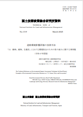生物多様性に関する技術資料 国総研資料第720号道路環境影響評価の技術手法「1.計画段階配慮事項」の動物、植物及び生態系に関する調査・予測・評価の参考資料 国総研資料第721号道路環境影響評価の技術手法「13.動物、植物、生態系」の環境保全措置に関する事例集参考資料令和6年度版(国総研資料第1319号)にリニューアル 国総研資料第722号地域生態系の保全に配慮したのり面緑化工の手引き 国総研資料第972号河川管理における外来植物防除に関するアンケート調査 国総研資料第1010号河川管理者のための外来植物防除対策解説書(案) 国総研資料第1014号在来野草の緑化利用に関する技術資料 国総研資料第1113号生物多様性の確保に結び付くみどりのまちづくりの実現に向けた市民参加生き物調査の実践・活用ガイド 国総研資料第1319号道路環境影響評価の技術手法「13. 動物、植物、生態系」における環境保全のための取り組みに関する事例集(令和6年度版)