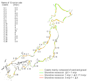 Since the period of high economic growth in Japan, river gravel has been taken to meet the growing demand for construction aggregate, and numerous dams have been constructed for securing water resources and for controlling floods. In coastal zones, on the other hand, harbors and fishing ports with large-scale breakwaters have been developed. Consequently, the equilibrium of sediment balance in coastal zones was disrupted, and 160 ha of the national land per annum has been lost due to considerable coastal erosion.