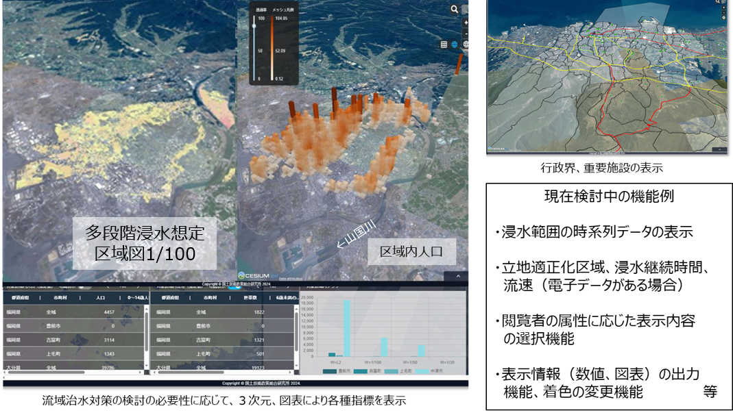 浸水リスク内の治水評価指標を3次元の地図空間上に表示できる「治水評価指標可視化ビューア」を整備しております。本ビューアでは、「浸水想定区域図電子化ガイドライン(第4版)」に基づき作成された浸水リスク(浸水想定区域、リスクマップ、対策効果を考慮し解析した結果等)のデータと、国土数値情報(人口等)を比較表示することができます。