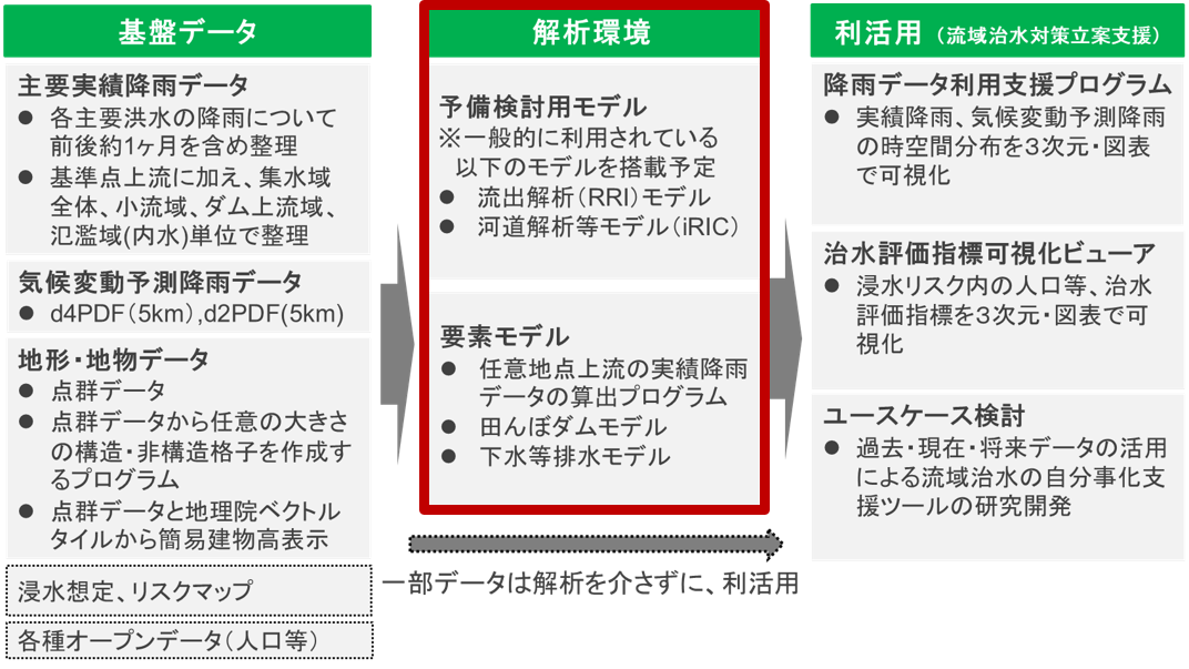 流域デジタルテストベッドでは、流出解析や洪水流解析を実施するための解析ツールとして、RRIモデルとiRICを用意します。また、田んぼダム等、流域治水対策を検討するための要素モデルを複数用意します。基盤データである降雨データや地形・地物データを解析ツールに読み込ませることで、流域治水対策の立案に必要となる流出解析や洪水流解析を実施することができます。