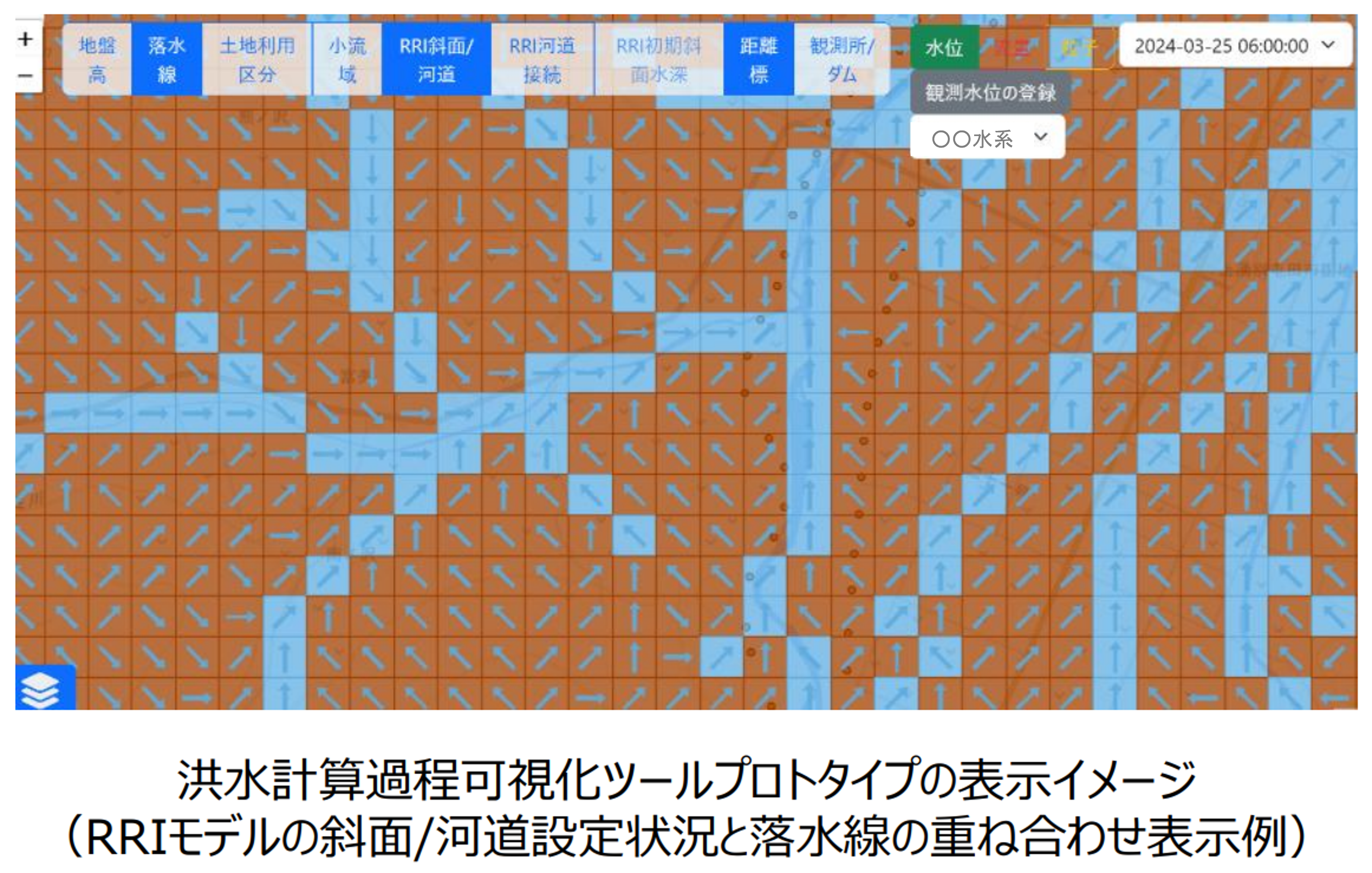 洪水予測技術の精度、実用性(計算安定)の確認を行うために必要となる「洪水計算過程可視化ツール」を搭載予定です。