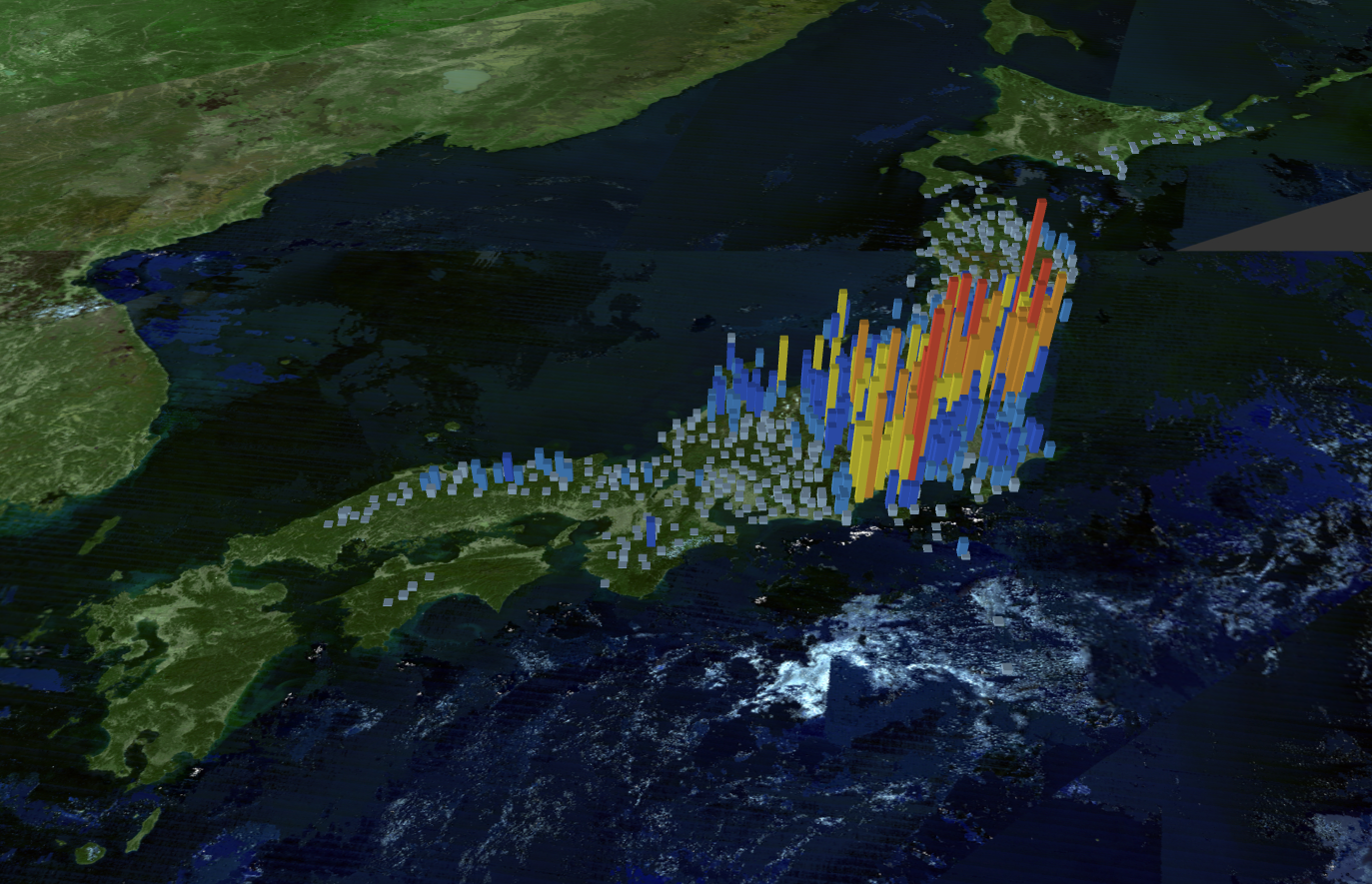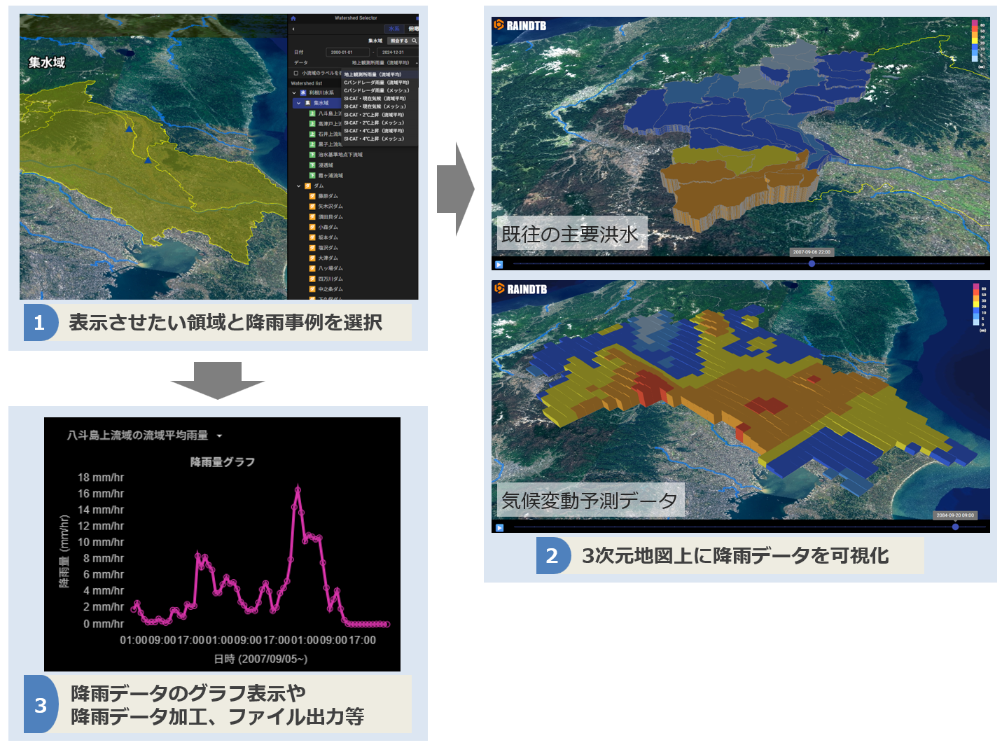 実績降雨、気候変動予測降雨の時空間分布を3次元・図表で可視化