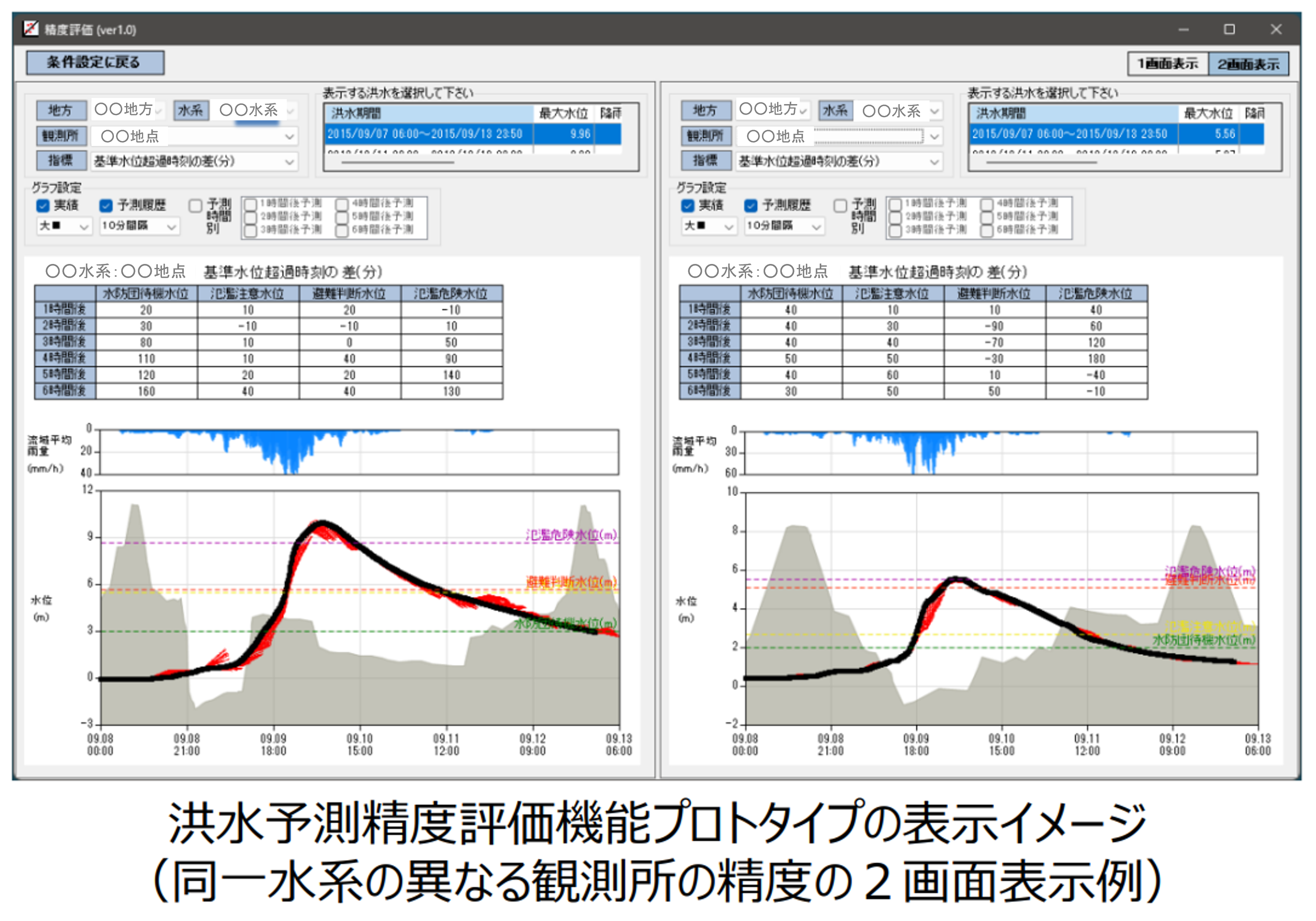 流域デジタルテストベッドでは、以下の項目を整理し、洪水予測技術の精度評価を行うために必要となる「精度評価ツール」を搭載予定です。