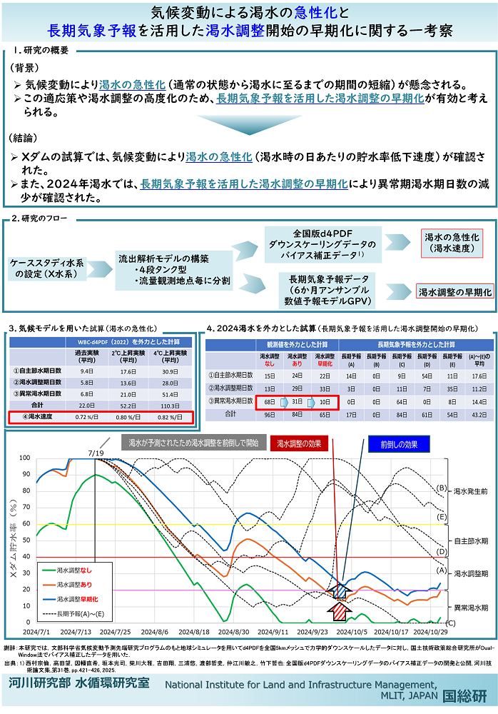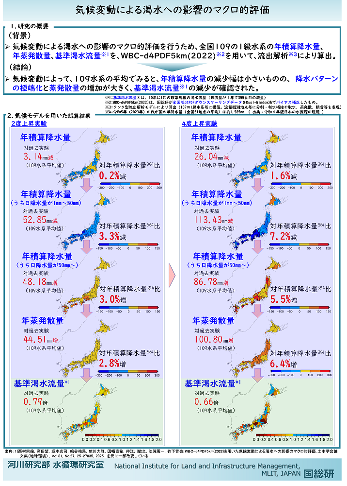 気候変動によって、降水パターンの極端化、蒸発散量の増加、積雪水量の減少が予測されています。これにより、渇水の激甚化が懸念されます。 そのため、気候モデルの出力結果を用いて、気候変動による渇水への影響の定量的・客観的な評価を進めています。