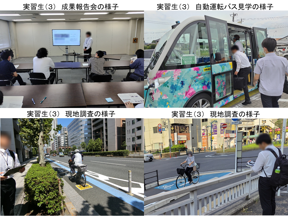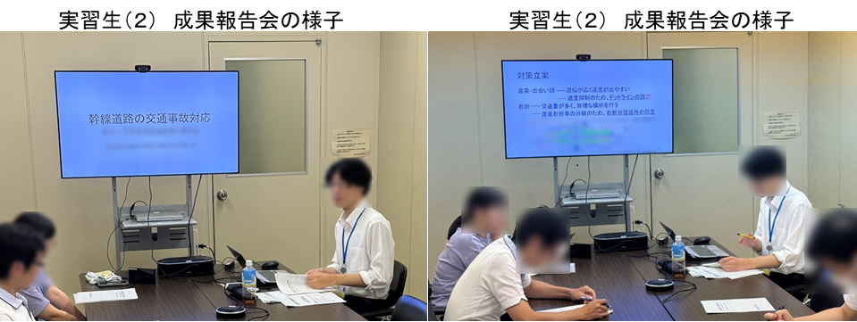 3人の夏期実習生が、国総研にて交通安全対策に関する実習を行い、成果報告会を行いました。 実習では、交通安全上の課題箇所や対策実施箇所の現地確認及びビッグデータによる分析などを行いました。