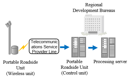 Portable RSUs are intended for flexible installation wherever necessary, so they are designed under the assumption that the dedicated optical network operated by MLIT does not exist in the vicinity of the target location. These units thus have a wireless unit that communicates with the control unit at each Regional Development Bureau via a telecommunications service provider’s lines. ETC2.0 probe data collected by the control units are sent to a processing server in the same way as with existing RSUs. The integrated server run by the Kanto Regional Development Bureau then aggregates and processes these data.