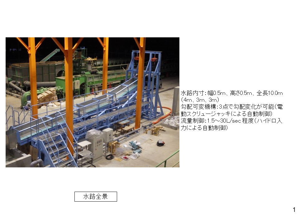 ★多段階可変勾配実験水路の概要 ・水路勾配を多階段に変化させ、土石流から掃流まで、流量、給砂量を自動制御できる大型実験水路